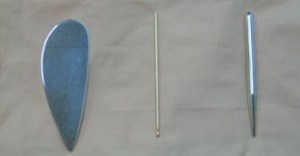 左から、調気鍼(銀)青木実意商店製/ 鍉鍼(金) 神戸源蔵鍼作所製/鍉鍼(銀)青木実意商店製